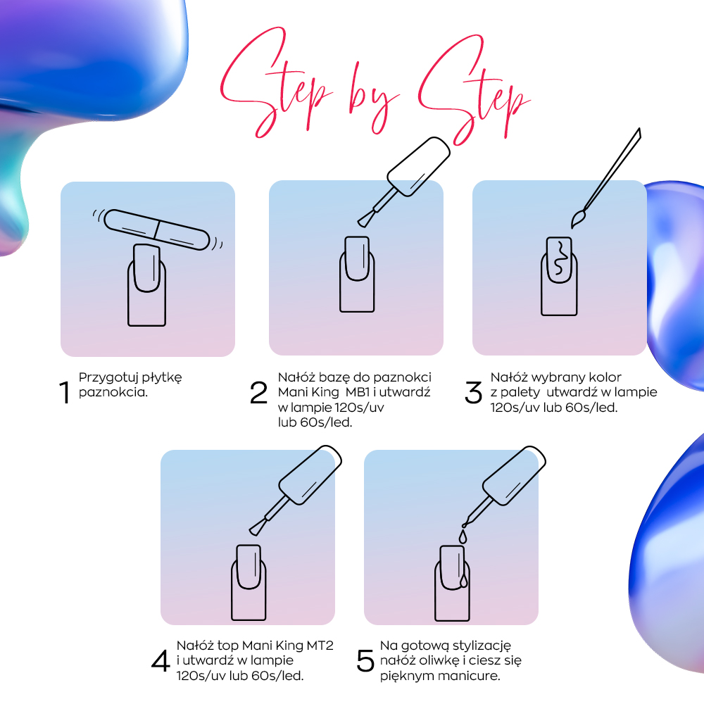 Apply a hybrid base to the prepared nail plate and cure it under an LED/UV lamp. Apply the selected color from the palette and cure it under an LED lamp for 60 seconds or a UV lamp for 120 seconds. Then apply a hybrid top coat and cure it under an LED/UV lamp.